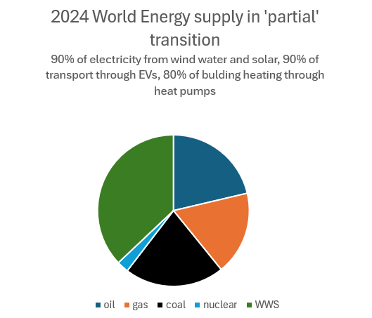 It should be emphasised that the model I use here deals only with a rather more limited process of electrification than will occur. I deal only with electrification of transport and space heating, and not all of these. I assume that 90 per cent of transport is electified, alongside 80 cent of space heating. I assume that 90 per cent of electricity is provided by renewables (WWS), the rest of electricity coming from nuclear power and some residual fossil fuels.