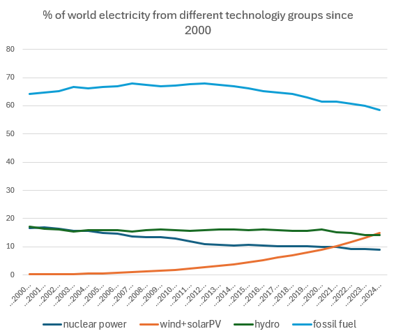 In the first case, the Figure 1 shows how renewables are becoming a larger and larger share of world electricity supply. Indeed almost all of new electricity generating capacity is now renewable. See my earlier post HERE.